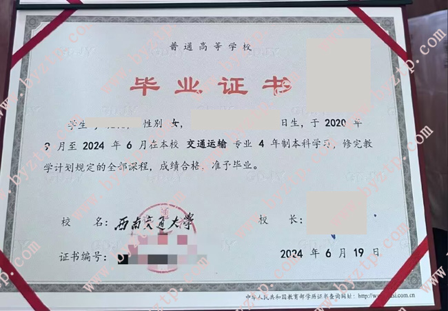 西南交通大学2024年全日制本科毕业证样本图片/模板样式(交通运输专业)