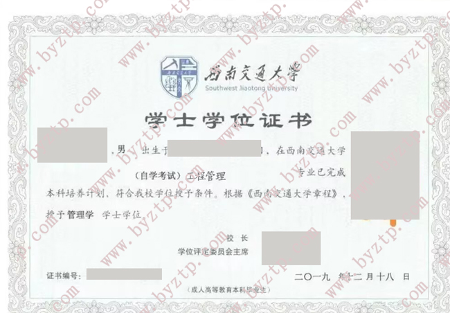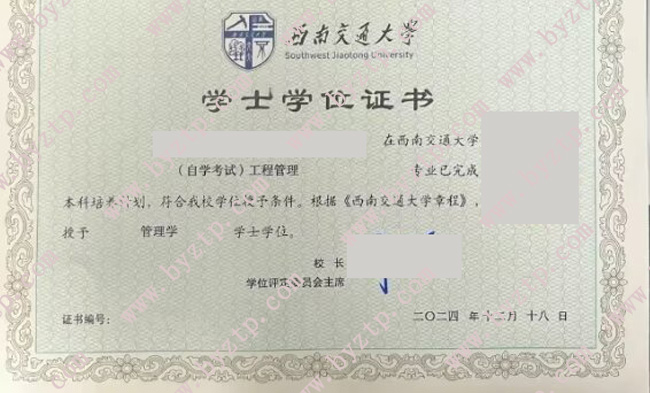 西南交通大学2024年自考本科学位证样本图片/模板样式(工程管理专业)