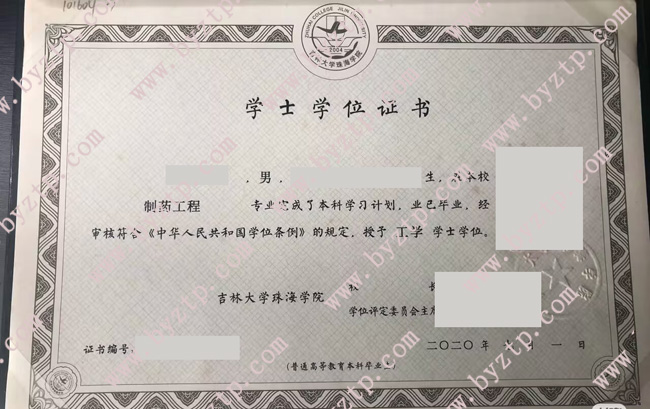 吉林大学珠海学院2020年全日制本科学位证模板/样本图片(制药工程专业)