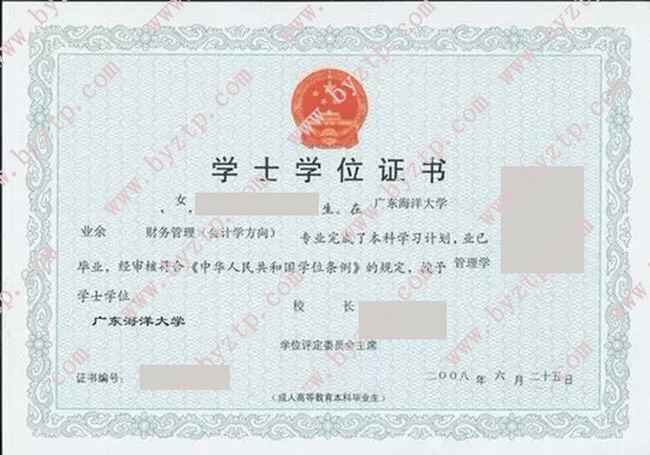 广东海洋大学2008年业余本科学位证模板/样本图片 (财务管理专业)