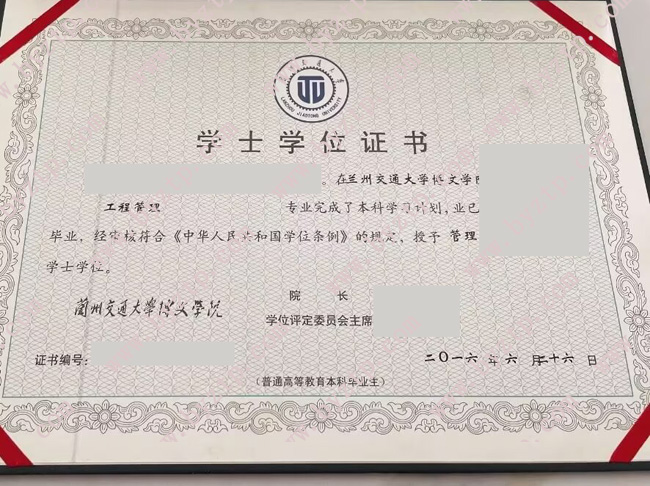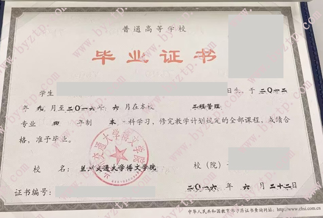 兰州交通大学博文学院2016年全日制本科毕业证模板图片(工程管理)