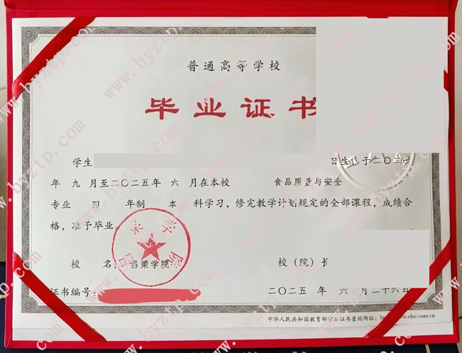 吕梁学院2025年全日制本科毕业证模板/样本图片(食品质量与安全)
