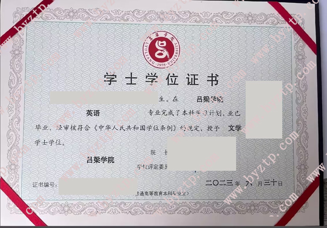 吕梁学院2023年全日制本科学位证模板/样本图片(英语)