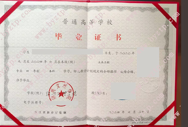 绍兴文理学院2024年全日制本科毕业证模板/样本图片(土木工程)