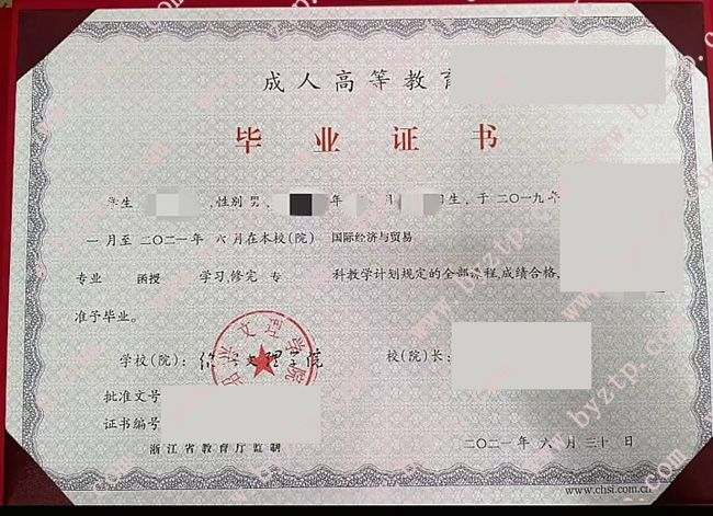 绍兴文理学院2021年成人教育函授专科毕业证模板/样本图片(国际经济与贸易)