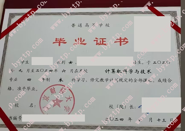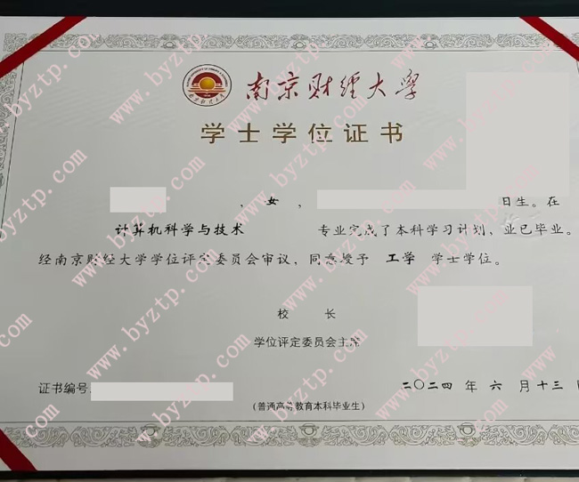 南京财经大学2024年全日制本科毕业证模板/样本图片(计算机科学与技术)