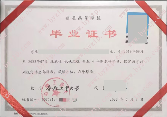 合肥工业大学2023年全日制本科毕业证样本图片(机械工程)