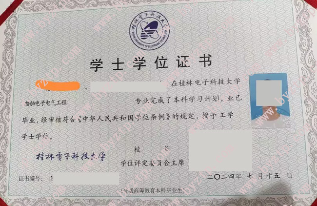 桂林电子科技大学2024年全日制本科学位证样本图片(船舶电子电气工程)