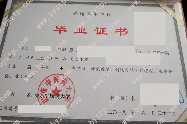 山东中医药大学2018年全日制本科毕业证模板/样本图片
