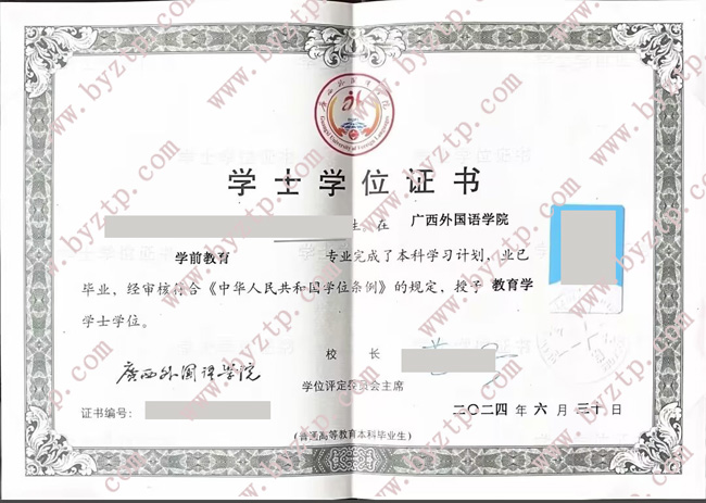 广西外国语学院2024年全日制本科学位证样本图片(学前教育)