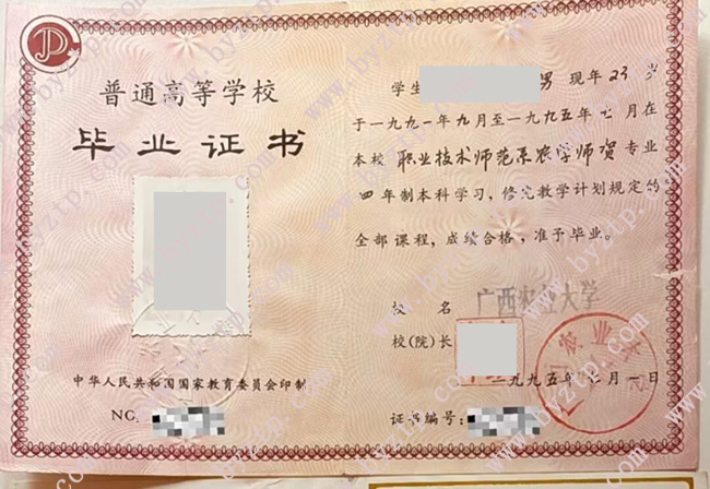 广西农业大学1995年全日制毕业证模板/样本图片(农学师资)