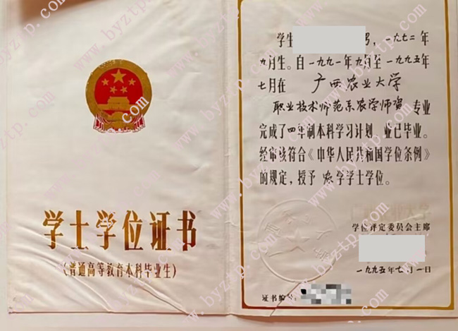 广西农业大学1995年全日制学位证模板/样本图片(农学师资)