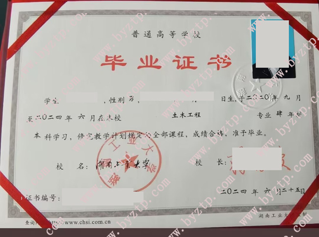 湖南工业大学2024年全日制本科毕业证样本图片(土木工程)