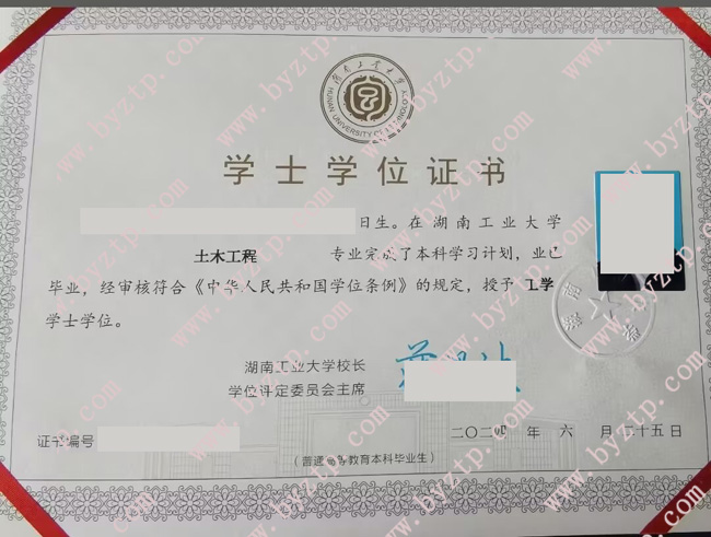 湖南工业大学2024年全日制本科学位证样本图片(土木工程)