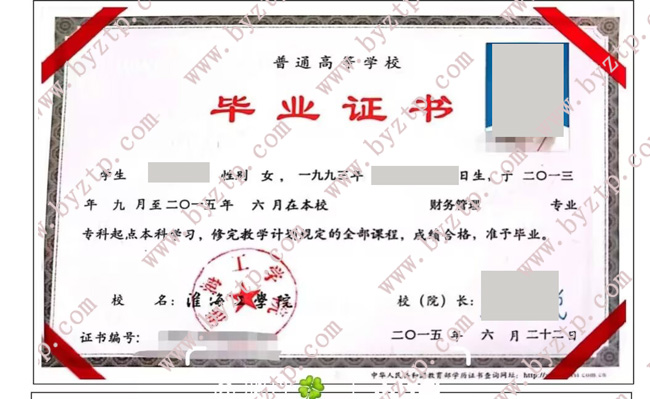 淮海工学院2015年专科起点本科毕业证模板/样本图片(财务管理)