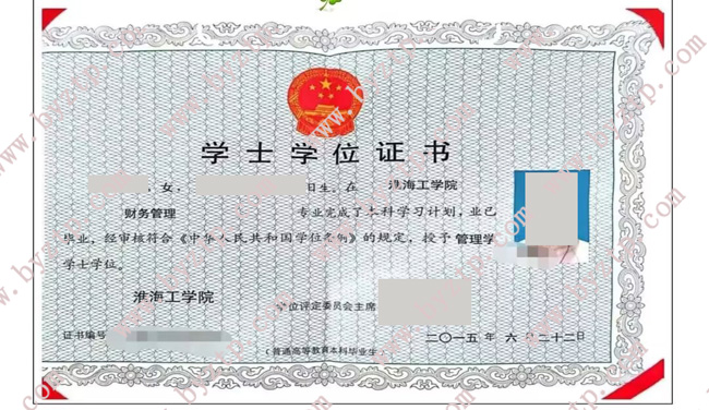 淮海工学院2015年全日制本科学位证模板/样本图片(财务管理)