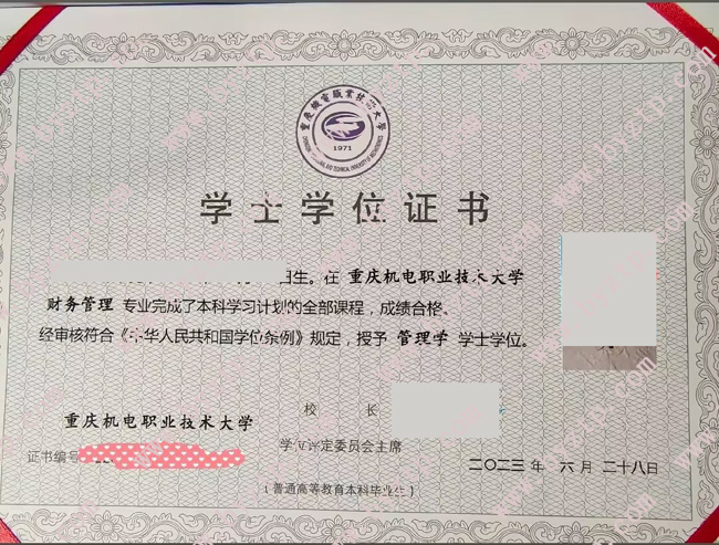 重庆机电职业技术大学2023年全日制本科学位证样本图片(财务管理)