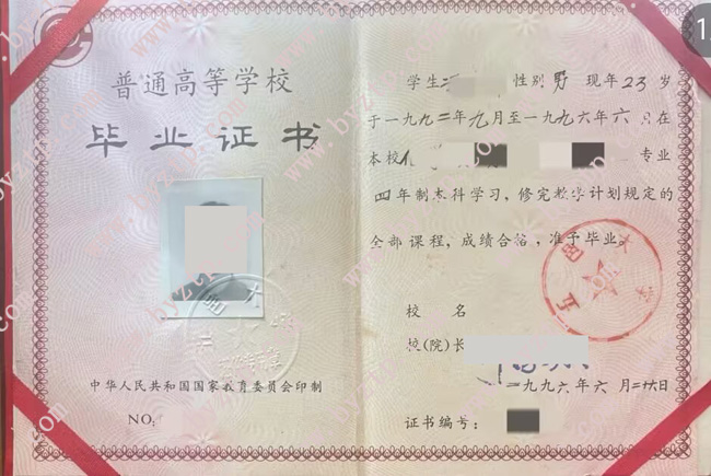 五邑大学1996年全日制本科毕业证样本图片