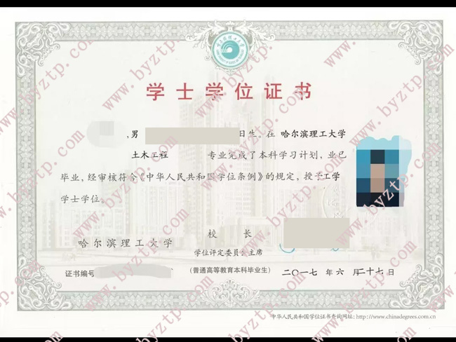 哈尔滨理工大学2017年全日制本科学位证样本图片(土木工程)