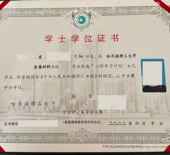 哈尔滨理工大学2022年全日制本科学位证样本图片(金属材料工程)