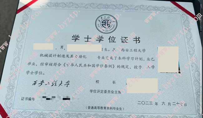 西安工程大学2023年全日制本科学位证样本图片(机械设计制造及其自动化)