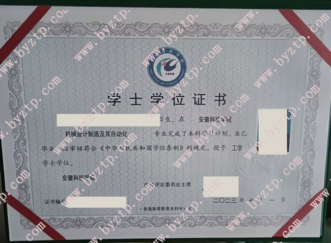 安徽科技学院2023年全日制本科毕业证样本图片(机械设计制造及其自动化)