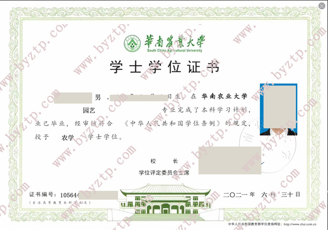 华南农业大学2021年全日制本毕业证样本图片(园艺)