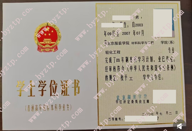 北京服装学院2007年全日制本科学位证样本图片(软化工程)