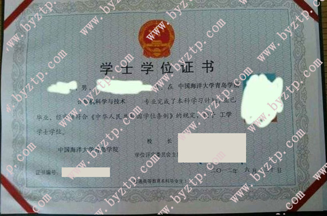 中国海洋大学青岛学院2012年全日制本科毕业证样本图片(计算机科学与技术)