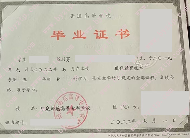 阳泉师范高等专科学校2022年全日制专科毕业证样本图片/模板(现代教育技术专业)