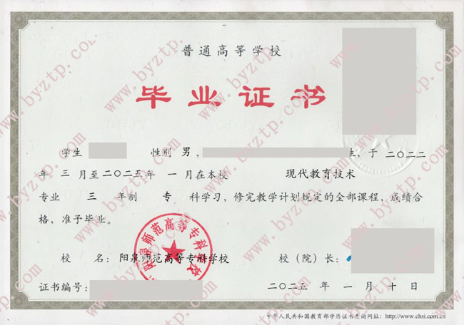 阳泉师范高等专科学校2025年全日制专科毕业证样本图片/模板(现代教育技术专业)