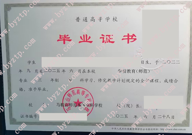 马鞍山师范高等专科学校2025年全日制专科毕业证样本图片(学前教育)