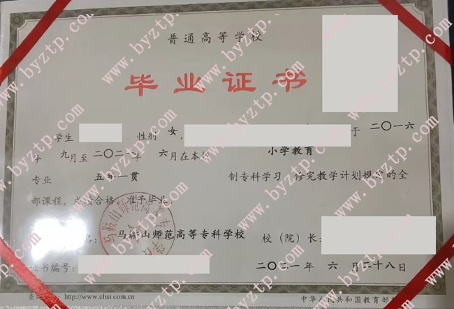 马鞍山师范高等专科学校毕业证样本图片/模板