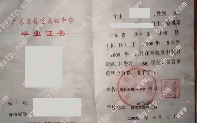 茂名市第一中学2009年高中毕业证样本图片