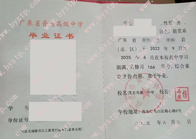 茂名市第一中学2025年高中毕业证样本图片