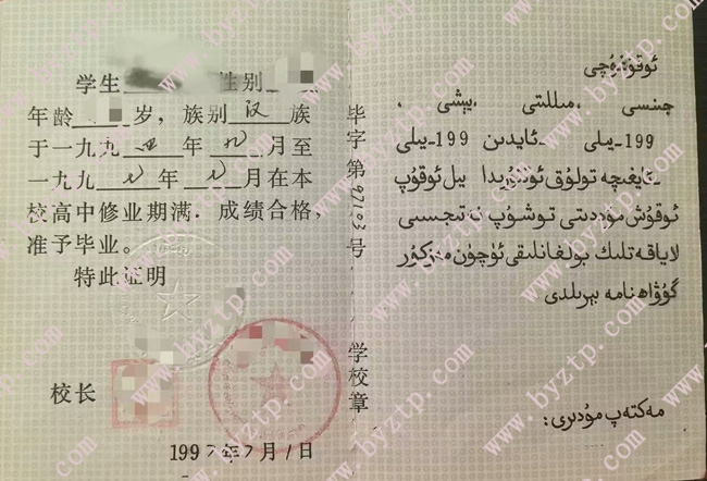 新疆维吾尔自治区1997年高中毕业证样本图片