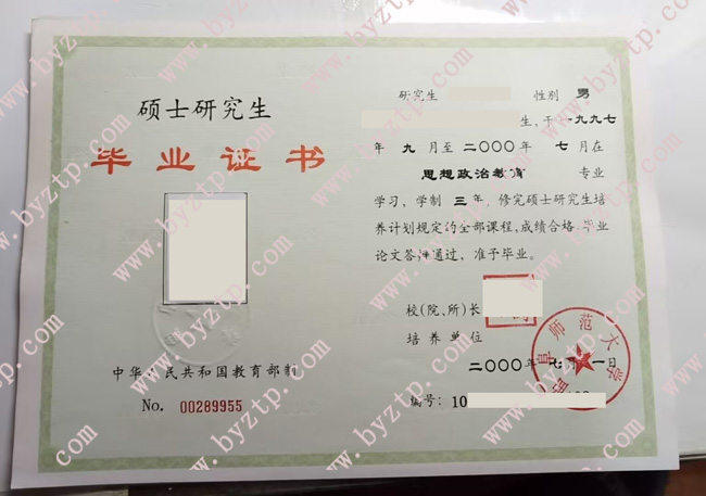 曲阜师范大学2000年全日制硕士毕业证样本图片(思想政治教育)